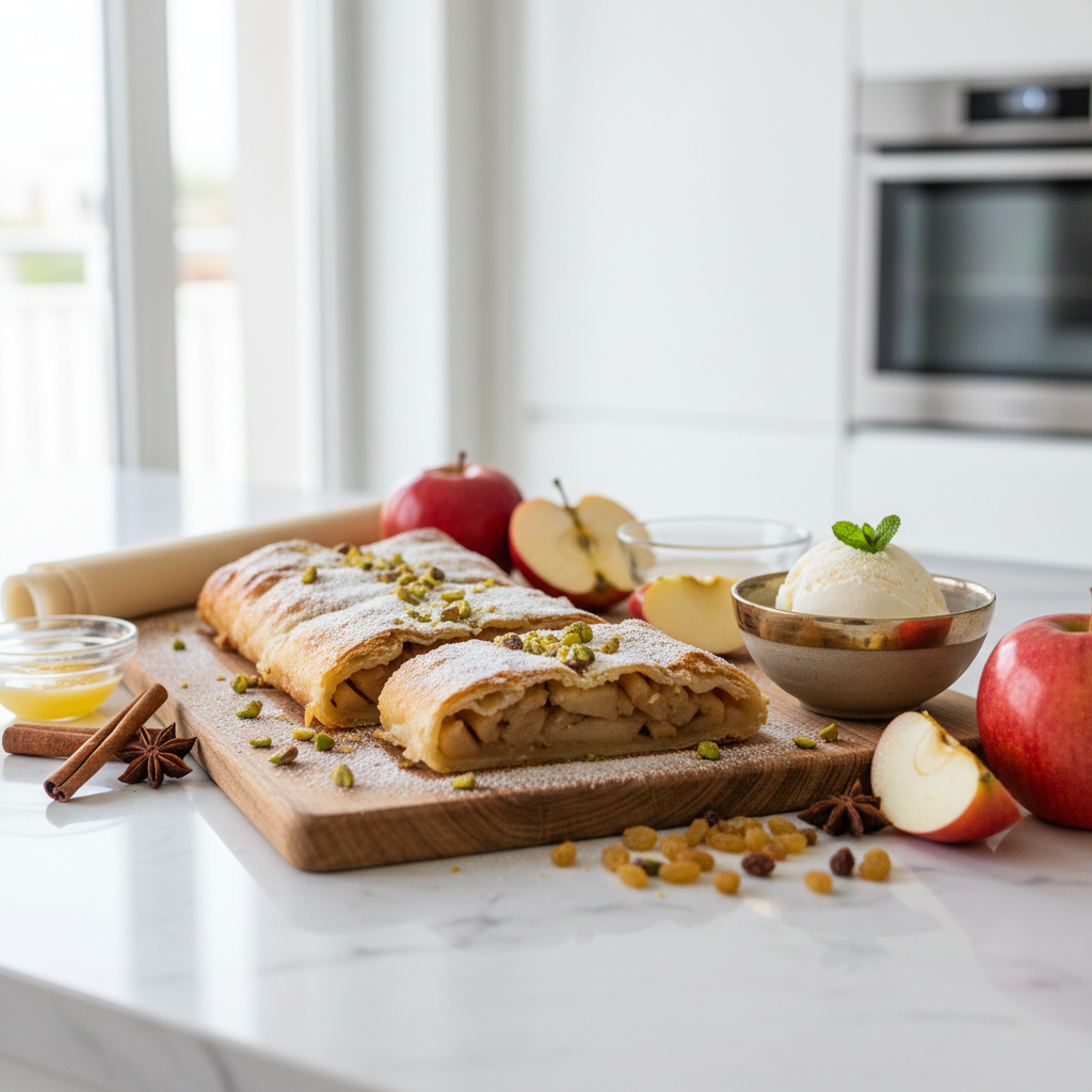 - Finishing (25-30 Min.): Strudel auf ein Backblech legen, Oberfläche leicht mit Milch bepinseln (statt Eigelb oder Butter) und backen, bis er goldbraun und knusprig ist.