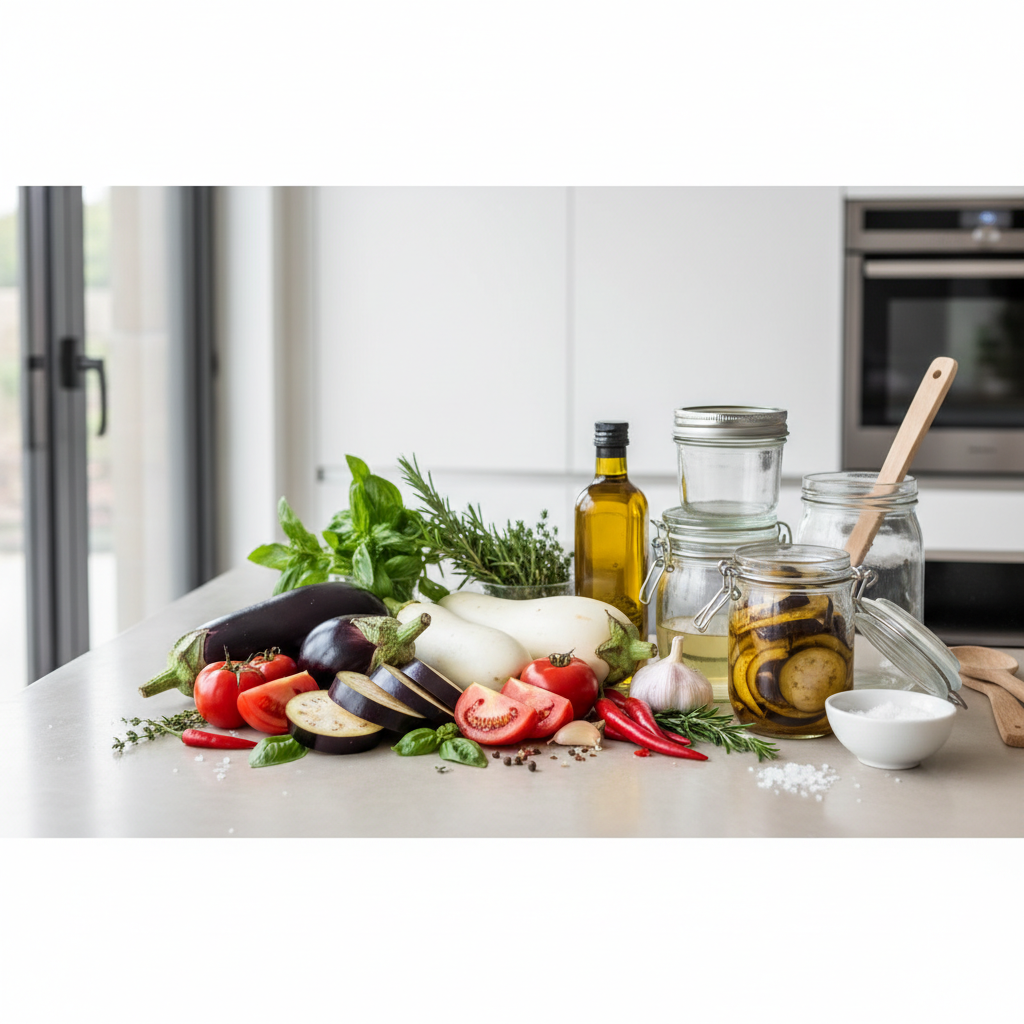 Zunächst werden die Auberginenwürfel meist angebraten oder im Ofen geröstet, um Röstaromen zu entwickeln. Anschließend werden sie mit den restlichen Zutaten in einem Topf zu einer dicklichen Masse gekocht. Diese heiße Masse wird dann in vorbereitete Gläser (Twist-off oder Weckgläser) gefüllt. Wichtig ist hierbei die Sauberkeit des Glasrandes – Fettspritzer oder Saucenreste verhindern, dass der Deckel ein Vakuum ziehen kann. Nach dem Verschließen werden die Gläser in einem Einkochautomaten oder einem großen Topf mit Wasserbad eingekocht. Dies unterscheidet sich von der reinen Öl-Methode, da hier das gesamte Glas samt Inhalt nochmals erhitzt wird.