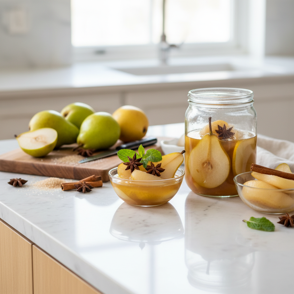 Birnen harmonieren geschmacklich mit einer Vielzahl von Gewürzen, die direkt in den Sud gegeben oder in die Gläser verteilt werden können. Traditionell werden Gewürze verwendet, die auch in der Winter- und Weihnachtsbäckerei vorkommen. Eine Stange Ceylon-Zimt, einige Gewürznelken oder ein Stück Sternanis pro Glas verleihen dem Kompott eine tiefe, warme Note. Auch das Mark einer halben Vanilleschote oder ein paar Streifen einer unbehandelten Zitronenschale runden das Geschmacksprofil ab. Die Gewürze werden entweder mit dem Zuckerwasser aufgekocht, um ihre ätherischen Öle in die Flüssigkeit abzugeben, oder als Ganzes dekorativ zu den Birnen in die Gläser gesteckt.