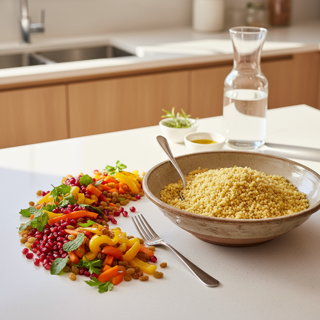 - Finishing (5 Min.): Nach 5-10 Minuten Quellzeit den Deckel abnehmen. Den Couscous mit einer Gabel kräftig auflockern, dabei die Körnchen voneinander trennen. Nicht mit einem Löffel rühren, da dies die Körner zerdrückt und zu einer matschigen Masse führt.