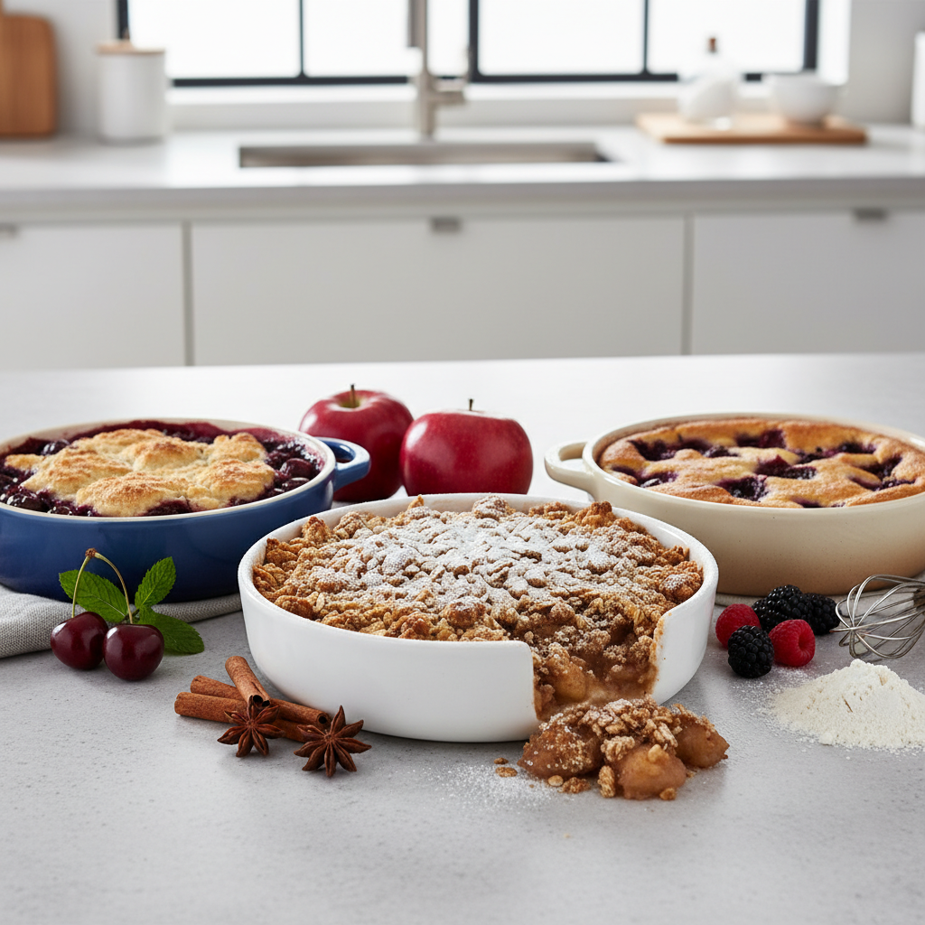Crumble, Cobbler und Clafoutis sind drei klassische, im Ofen gebackene Fruchtdesserts, die sich hauptsächlich durch ihre Toppings oder Teigbasis unterscheiden. Während der Crumble eine knusprige Streuseldecke hat, wird der Cobbler mit einem keksartigen Teig bedeckt und der Clafoutis ist ein puddingartiger Eierteig, in den Früchte eingebettet werden.