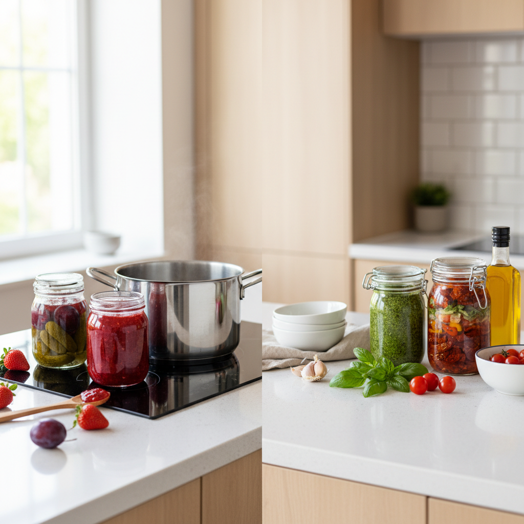 - Sicherheit: Für säurearme Lebensmittel (Gemüse, Fleisch) ist Einkochen zwingend erforderlich, um Bakteriensporen abzutöten.