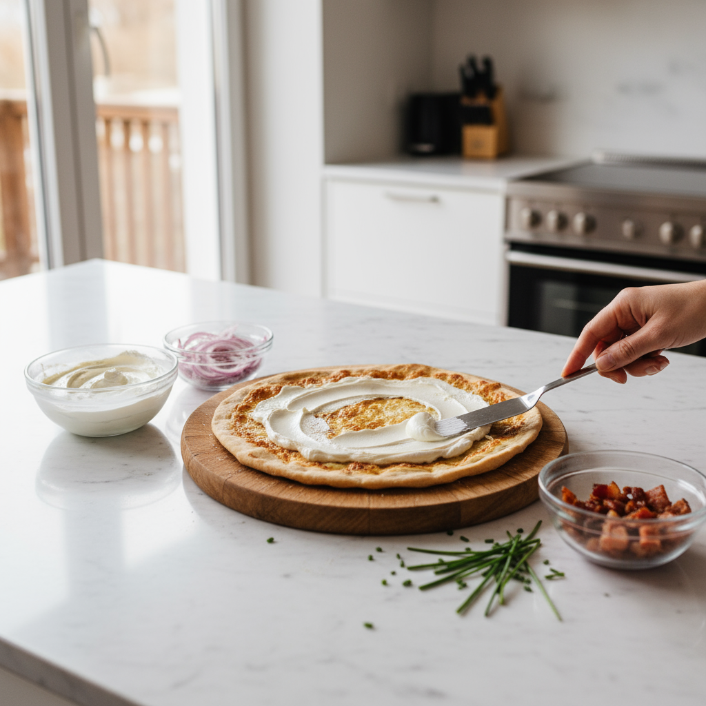 Für einen hauchdünnen Boden eignen sich Beläge, die nicht zu feucht sind und keine lange Garzeit benötigen. Der klassische Belag aus Crème fraîche, dünnen Zwiebelringen und Speckwürfeln ist ideal. Wichtig ist, die Crème fraîche nur dünn aufzustreichen. Andere gut geeignete Zutaten sind Lauch, dünn geschnittene Pilze, Ziegenkäse, Birnen oder Äpfel in feinen Spalten. Stark wasserhaltige Gemüse wie Tomaten oder Zucchini sollten sehr dünn geschnitten oder vorher kurz angedünstet werden, um zu verhindern, dass sie den Boden durchweichen.