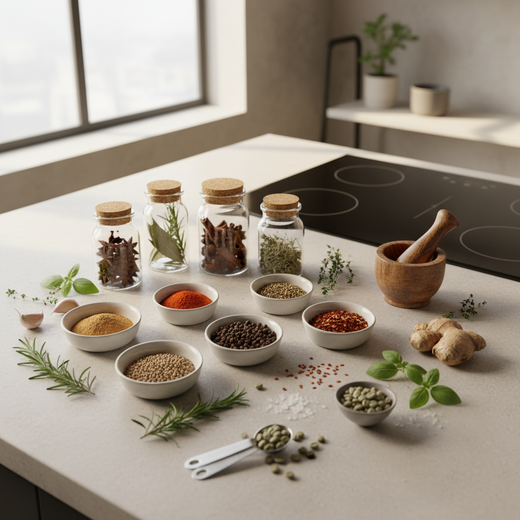 Eine Gewürz-Grundausstattung ist eine sorgfältig ausgewählte Sammlung von Gewürzen und getrockneten Kräutern, die eine breite Palette von alltäglichen Gerichten abdeckt. Ziel ist es nicht, jedes erdenkliche Gewürz zu besitzen, sondern eine vielseitige Basis zu schaffen, die durch wenige Spezialisten je nach Geschmack und Kochgewohnheiten erweitert werden kann.