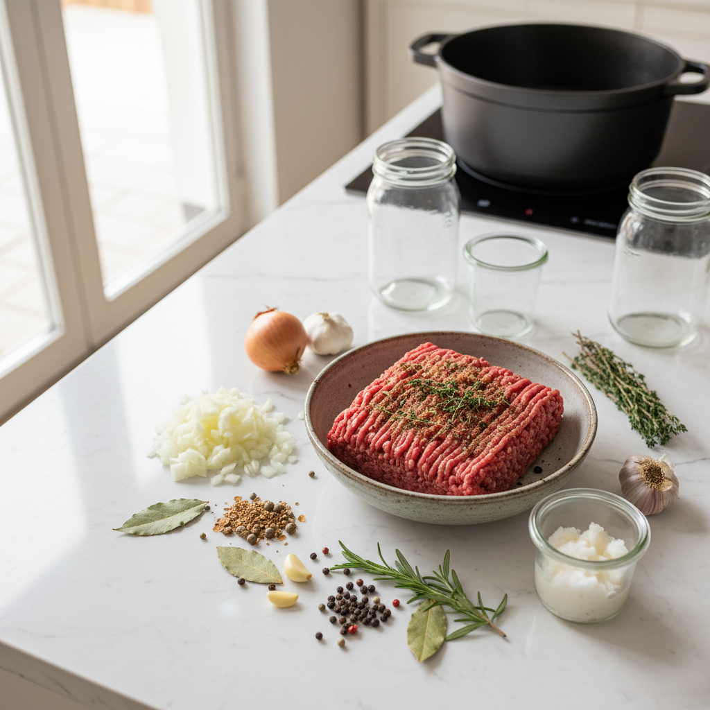 - Vorbereitung (30 Min.): Das Hackfleisch krümelig und vollständig durchbraten. Gläser und Deckel bei 100°C sterilisieren.