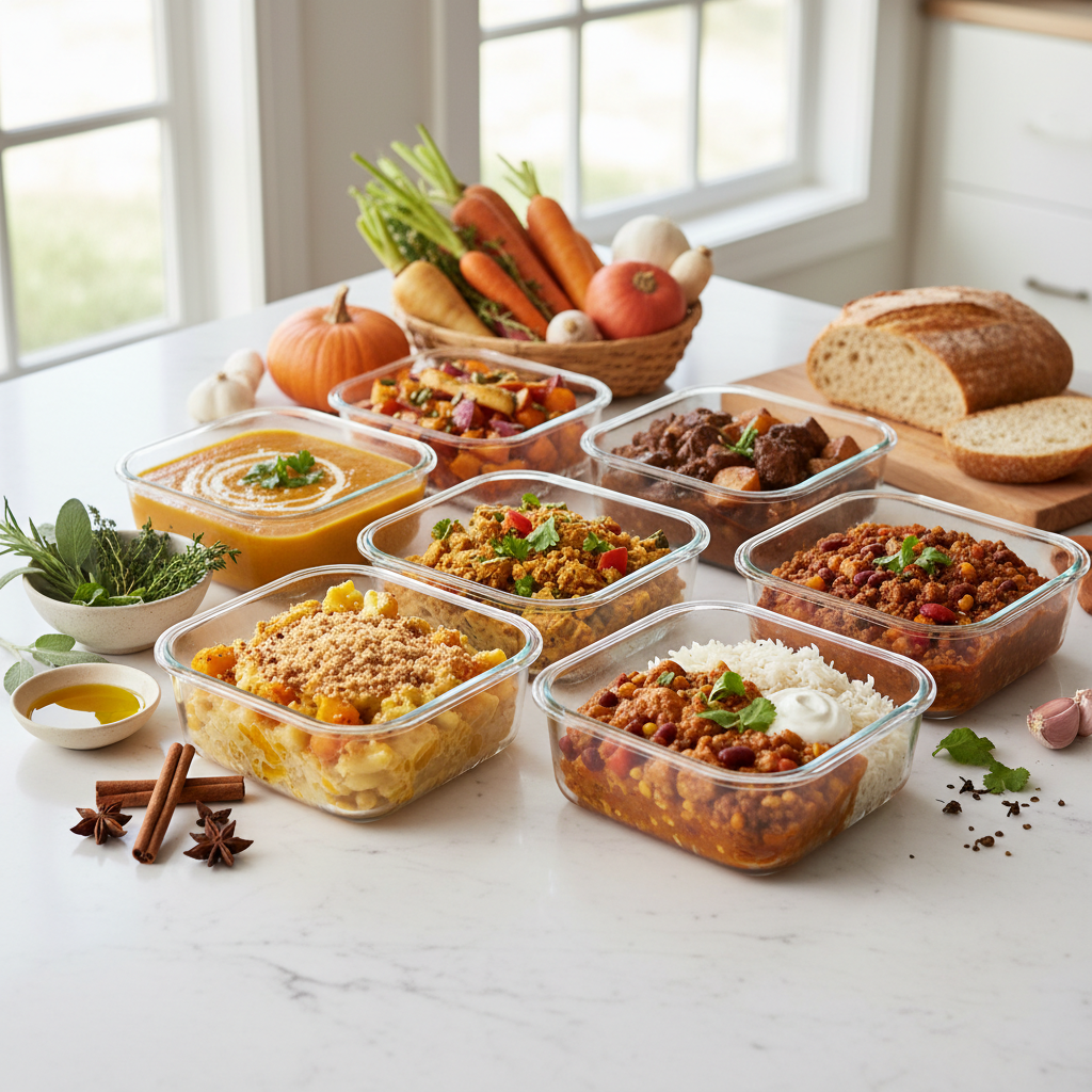 - Planung (30 Min.): Wochenplan erstellen, Rezepte auswählen und Einkaufsliste schreiben. Fokus auf saisonale Zutaten wie Kürbis, Wurzelgemüse und Kohl.