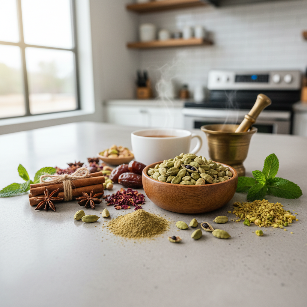In der arabischen Welt hat grüner Kardamom eine besondere kulturelle Bedeutung. Er wird traditionell zur Aromatisierung von Kaffee (Qahwa) verwendet. Hierfür werden oft ganze, leicht angedrückte Kapseln mit dem Kaffeepulver aufgebrüht. Der Kardamom verleiht dem starken Kaffee eine würzige, erfrischende Note und gilt als Zeichen der Gastfreundschaft. Auch in Tees, insbesondere im indischen Masala Chai, spielt er eine zentrale Rolle und harmoniert wunderbar mit Zimt, Ingwer, Nelken und schwarzem Pfeffer. Beim Kochen kann man entweder die ganze Kapsel verwenden, die ihr Aroma langsam an die Flüssigkeit abgibt, oder die Samen entnehmen und im Mörser zerstoßen, um ein intensiveres Ergebnis zu erzielen.