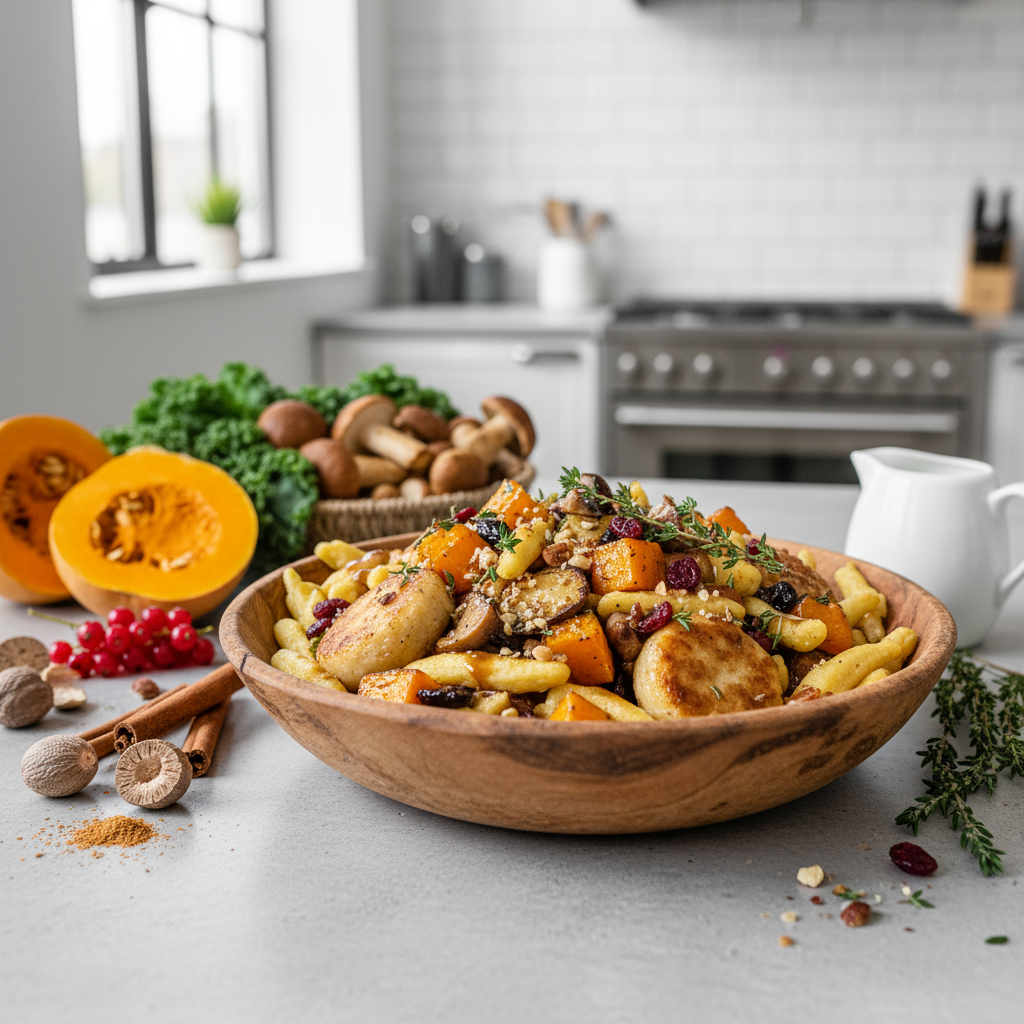 - Kulinarisches Grundprinzip: Sättigende, milde Teigwaren aus dem Süden (Knödel, Spätzle) dienen als neutrale und saugfähige Basis für die kräftigen, erdigen Aromen norddeutscher Herbstzutaten (Wurzelgemüse, Kohl, Wildpilze).