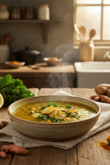 Diese Grünkohlsuppe mit Ingwer und Kurkuma bietet eine moderne, leichte Alternative zum…