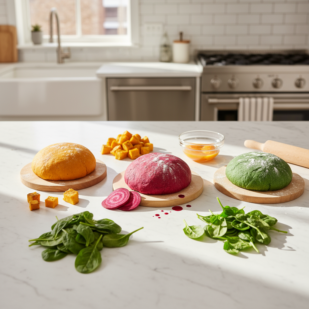 - Grundlagen des Teigs: Ein klassischer Nudelteig besteht aus Hartweizenmehl (Tipo 00 oder Semola) und Eiern. Für farbigen Teig wird ein Teil der Flüssigkeit durch konzentriertes Gemüse-Püree ersetzt.