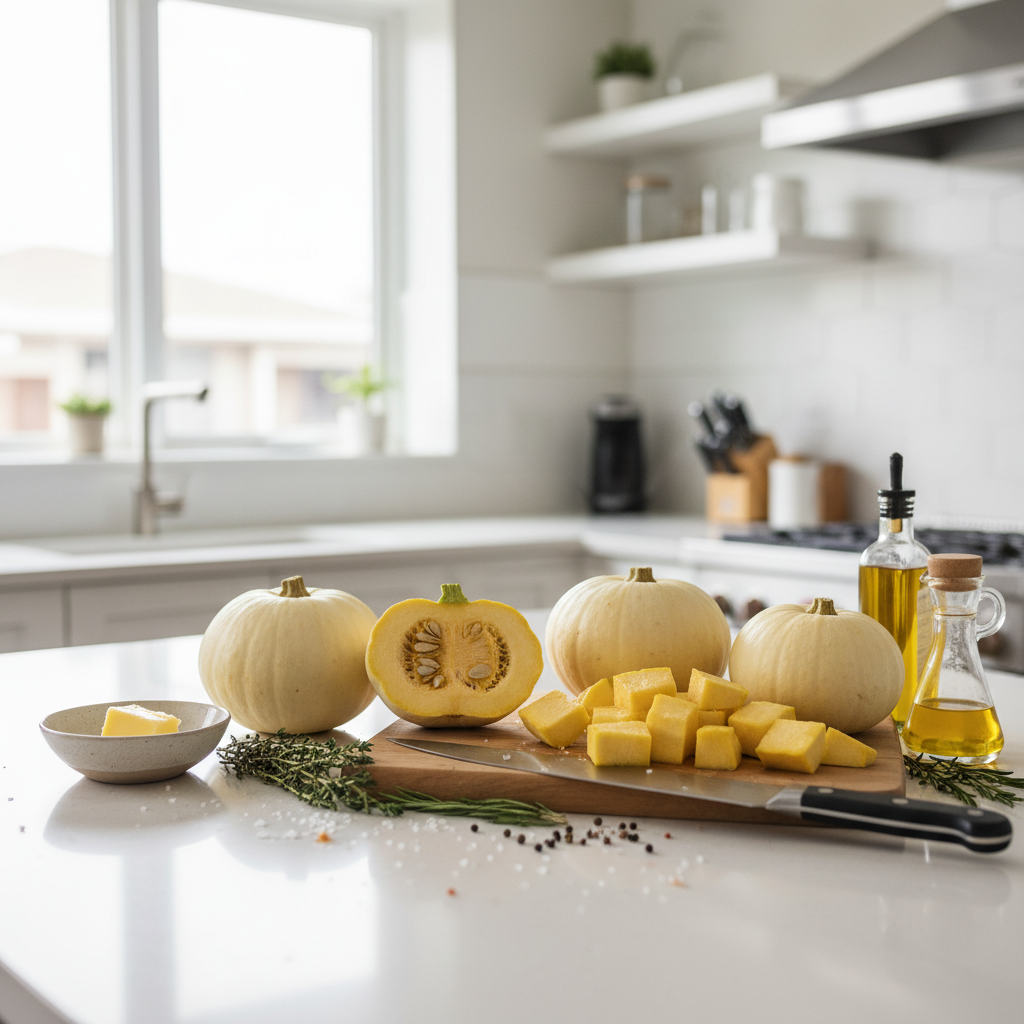 - Finishing & Kontrolle (2 Min.): Nach etwa 20 Minuten mit einer Gabel prüfen, ob der Patisson gar ist. Er sollte weich sein, aber noch leichten Biss haben und an den Rändern leicht gebräunt sein. Vor dem Servieren optional mit frischen Kräutern oder etwas Zitronensaft verfeinern.