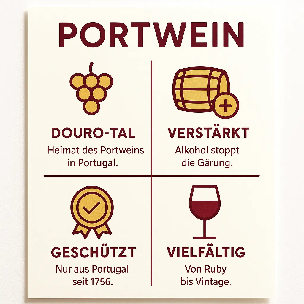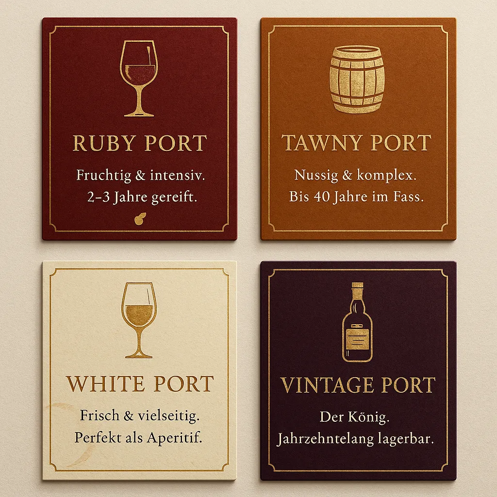 - Hauptstile: Ruby (fruchtig, flaschengereift) und Tawny (nussig, fassgereift).
