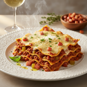 Die Zubereitung einer authentischen italienischen Lasagne erfordert Präzision, Zeit und ein grundlegendes Verständnis für die biochemischen Prozesse beim Kochen. Dieses Rezept verzichtet auf Abkürzungen und konzentriert sich auf ein tiefgründiges Ragù auf Basis von Pancetta, traditionellem Wurzelgemüse und hochwertigem Rinderhackfleisch. Durch den gezielten Einsatz von trockenem Weißwein und einer ausgedehnten Schmorzeit entwickelt die Fleischsauce eine komplexe Aromenstruktur. Im Gegensatz zu schnellen Alltagsversionen setzt diese Lasagne mit Pancetta auf bewährte Handwerkstechniken: Ein sorgfältig geröstetes Soffritto bildet das Fundament, während die langsame Reduktion der Flüssigkeiten für eine dichte, aromatische Sauce sorgt. Du erfährst in diesem Beitrag exakt, warum das Auslassen des Bauchspecks essenziell ist, wie die Maillard-Reaktion den Fleischgeschmack intensiviert und welche Schichttechnik verhindert, dass die Lasagne beim Anschnitt zerfällt. Folge dieser strukturierten Anleitung, um ein professionelles Ergebnis in deiner eigenen Küche zu reproduzieren.