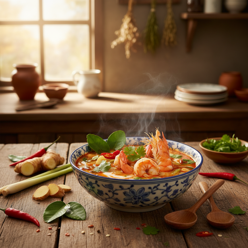 Die Tom Yum Suppe, in dieser Variante als Tom Yum Goong (mit Garnelen) bekannt, ist ein Grundpfeiler der thailändischen Küche. Ihr charakteristisches Geschmacksprofil entsteht durch eine präzise Balance aus Säure, Schärfe, Salzigkeit und Umami. Dieses Rezept führt dich durch die exakten Schritte, um eine aromatisch tiefgründige und authentische Brühe zu kreieren, die den Kern dieser Suppe ausmacht. Wir konzentrieren uns auf die korrekte Extraktion der Aromen aus den Schlüsselzutaten wie Galgant, Zitronengras und Kaffirlimettenblättern. Du lernst nicht nur die Zubereitung, sondern auch die Funktion jeder einzelnen Zutat und die technischen Hintergründe, die für ein gelungenes Ergebnis entscheidend sind. Das Resultat ist keine Annäherung, sondern eine Suppe mit der authentischen Komplexität, die man von einem erstklassigen thailändischen Gericht erwartet.