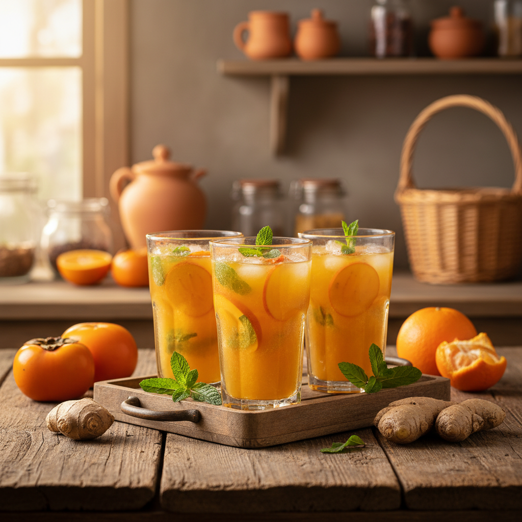 Aromatischer Kaki Orangen Saft mit Ingwer und Minze