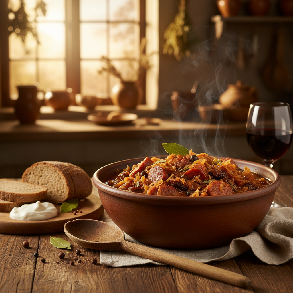 - Serviervorschlag: Bigos wird klassisch mit frischem Bauernbrot oder Salzkartoffeln serviert.