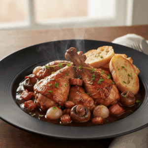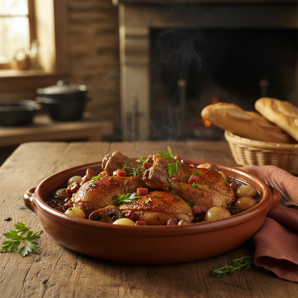 Aromatisches Coq au Vin: Geschmortes Hähnchen in kräftigem Rotwein