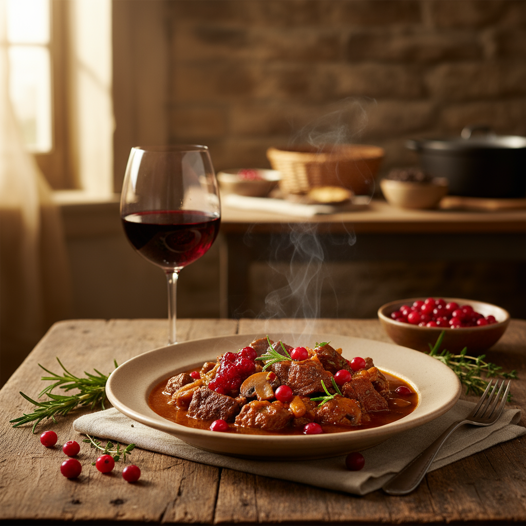Aromatisches Wildschweingulasch mit Preiselbeeren und Rotwein