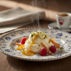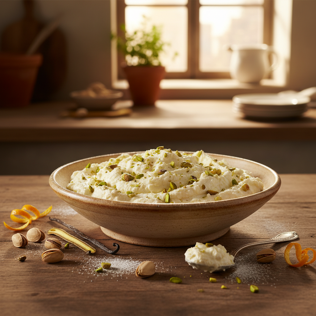 Eine feine, traditionelle Dessertcreme auf Basis von abgetropftem Ricotta. Die Kombination aus echter Vanille, frischem Orangenabrieb, dunkler Schokolade und gerösteten Pistazien sorgt für ein ausgewogenes, vielschichtiges Aroma und eine samtige Textur.