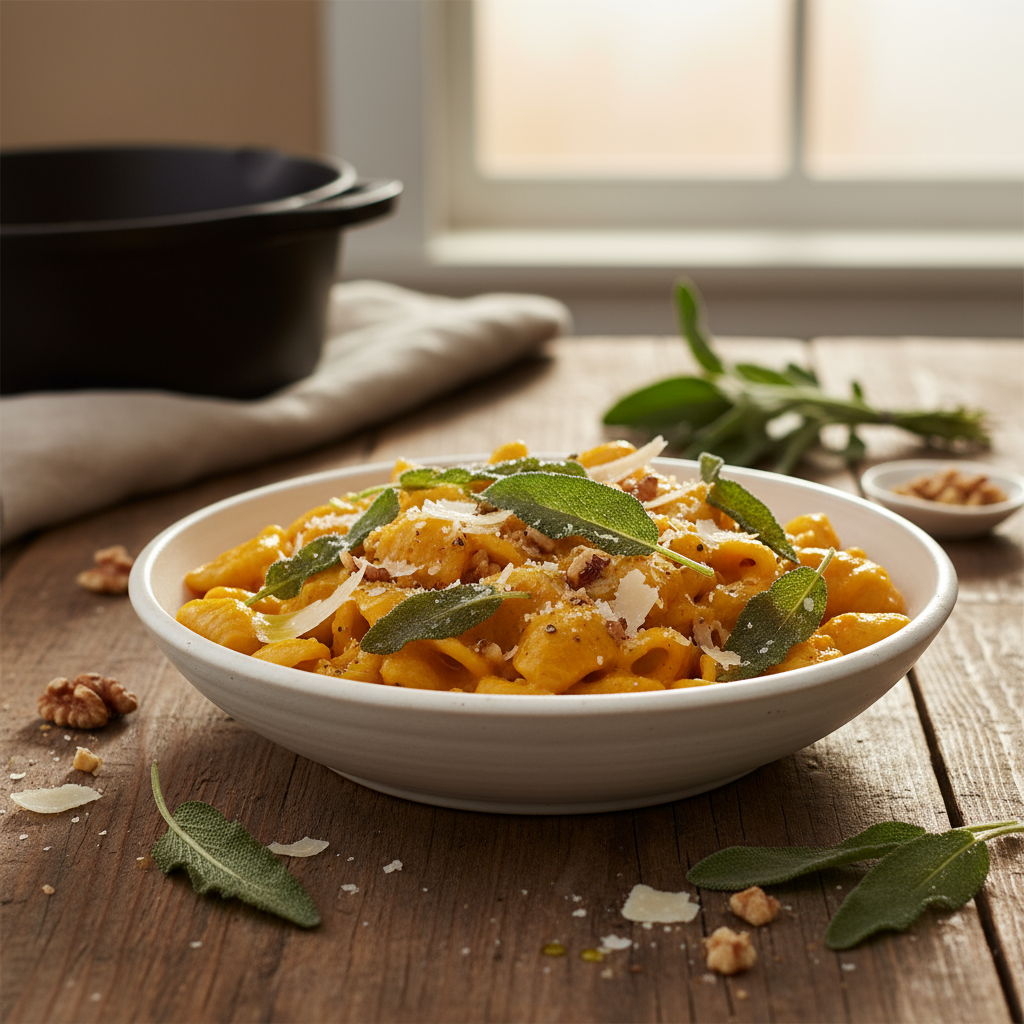 - Servieren: Die Kürbispasta sofort auf vorgewärmte Teller verteilen. Nach Belieben mit zusätzlichem geriebenen Parmesan, einer Prise frisch gemahlenem Pfeffer und optional einigen frischen Salbeiblättern garnieren.