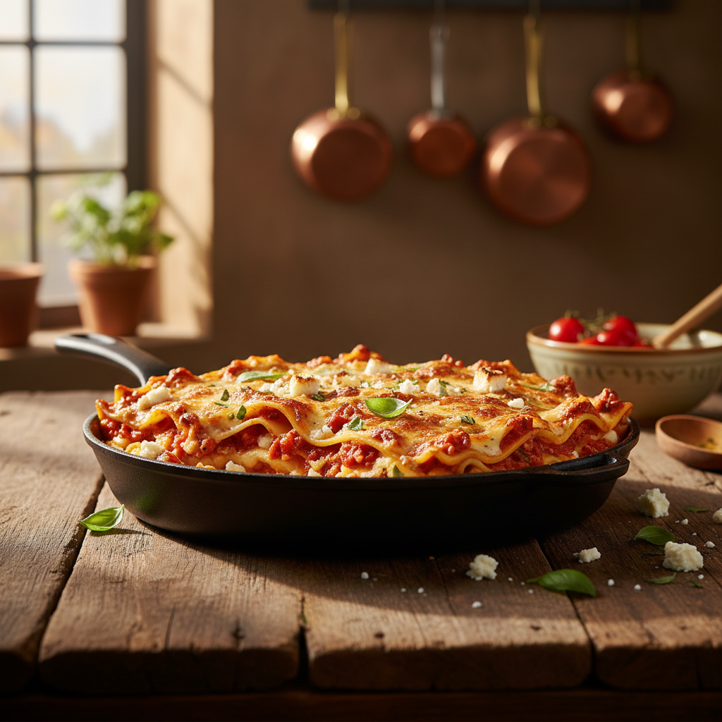 Eine cremige Lasagne mit Feta bietet eine effiziente und geschmacksintensive Alternative zum klassischen Ragù alla Bolognese. Durch den bewussten Verzicht auf eine aufwendige Béchamelsauce und den Einsatz einer schnellen Feta-Crème-fraîche-Mischung sparst du Zeit, ohne Kompromisse bei der Textur einzugehen. Der salzig-würzige Charakter des Schafskäses harmoniert präzise mit der Säure der reduzierten Tomatensauce. Dieses Rezept ist strukturiert aufgebaut, um dir eine formstabile, perfekt geschichtete vegetarische Lasagne zu garantieren. Wenn du die zugrundeliegenden Techniken – von der Feuchtigkeitskontrolle der Sauce bis zur essenziellen Ruhephase nach dem Backen – exakt anwendest, erzielst du ein professionelles Ergebnis mit exzellentem Mundgefühl.