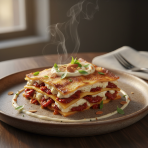 Die Konstruktion einer pflanzlichen Lasagne ohne Einbußen bei Textur und Geschmack erfordert ein genaues Verständnis der Zutatenfunktionen. Dieser Beitrag analysiert die Zubereitung einer cremigen Lasagne, die vollständig auf tierische Produkte verzichtet. Anstelle einer klassischen Béchamelsoße aus Butter und Weizenmehl nutzen wir eine Emulsion aus blanchierten Mandeln und pflanzlicher Milch. Die Kombination mit sonnengetrockneten Tomaten und Hefeflocken liefert die notwendige Dichte an Umami, die oft bei milchfreien Alternativen fehlt. Du erfährst in den folgenden Abschnitten exakt, wie du durch technische Präzision beim Schichten und das richtige Feuchtigkeitsmanagement ein strukturell stabiles und geschmacklich tiefes Ergebnis erzielst.