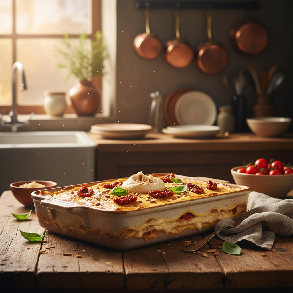 Cremige Lasagne mit getrockneten Tomaten und Mandelcreme