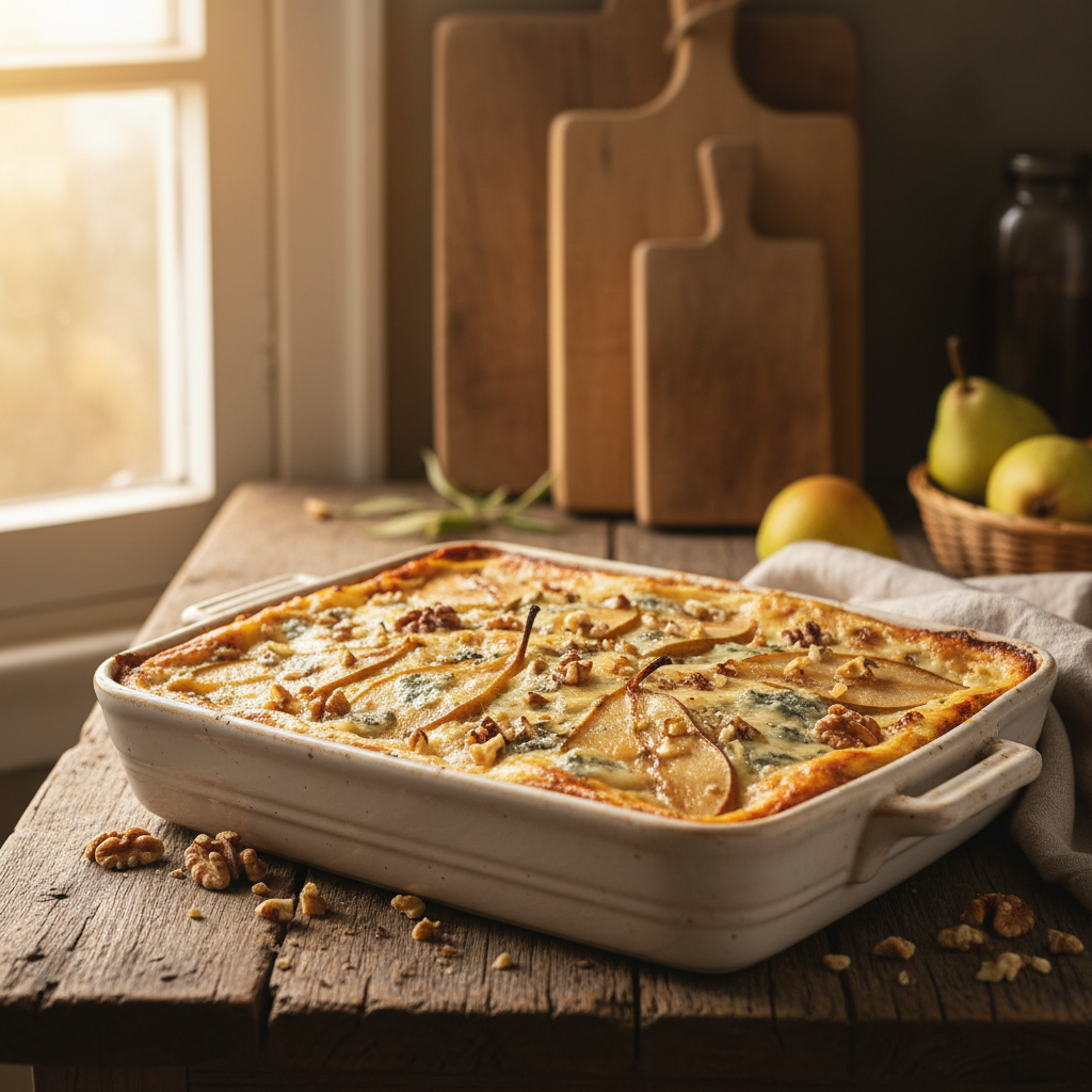 Die Kombination aus herzhaftem Blauschimmelkäse und süßem Obst ist ein fundierter Klassiker der professionellen Kulinarik. Diese cremige Gorgonzola Lasagne mit Birnen und Walnüssen übersetzt dieses bewährte Geschmacksprofil in ein strukturiertes, wärmendes Ofengericht. Der zentrale technische Vorteil dieses Rezepts liegt in der Integration des Gorgonzolas direkt in die heiße Béchamelsauce. Dadurch entsteht eine stabile Emulsion, die den Lasagneplatten die notwendige Feuchtigkeit liefert, ohne dass sich Fett und Flüssigkeit beim Backen trennen. Die vorab gerösteten Walnüsse steuern wichtige Röstaromen und einen knusprigen Biss bei, während festkochende Birnen durch ihren natürlichen Fruchtzucker einen notwendigen Kontrast zur intensiven Salzigkeit des Käses bilden. In diesem Beitrag erfährst du, wie du eine fehlerfreie Mehlschwitze herstellst, die Zutaten technisch optimal schichtest und die Garzeit so steuerst, dass das Endprodukt eine perfekte Schnittfestigkeit aufweist.