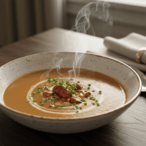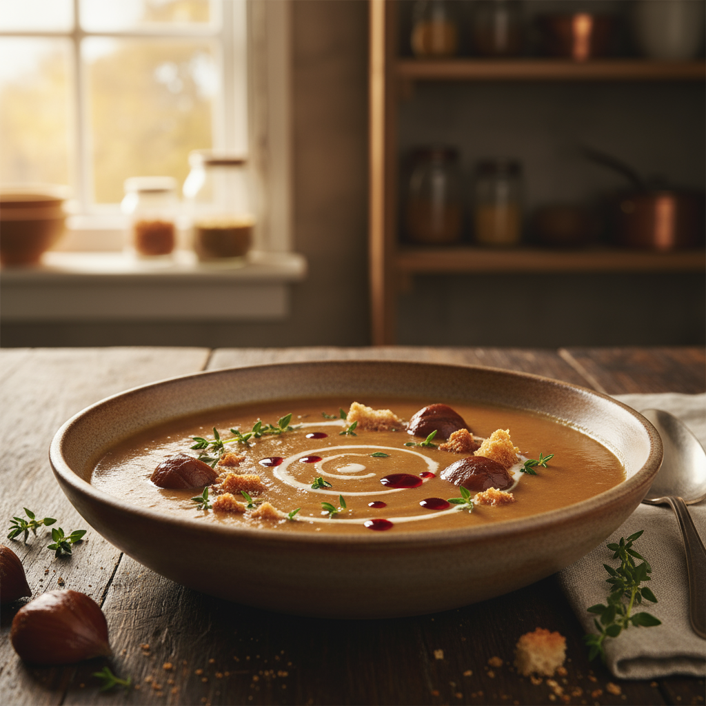 Diese cremige Maronensuppe ist ein Paradebeispiel für eine elegante und dennoch unkomplizierte Herbst- und Winterküche. Das Rezept konzentriert sich auf die wesentlichen Komponenten, um den erdigen, leicht süßlichen Geschmack der Esskastanien optimal zur Geltung zu bringen. Durch die Kombination mit trockenem Sherry, frischem Thymian und einer kräftigen Gemüsebrühe entsteht eine Suppe mit bemerkenswerter geschmacklicher Tiefe. In diesem Beitrag erhältst du nicht nur eine präzise Anleitung, sondern auch das nötige Hintergrundwissen zu den entscheidenden Techniken – vom korrekten Anrösten für intensive Aromen bis hin zum Erreichen der perfekten, samtigen Konsistenz ohne den Einsatz zusätzlicher Bindemittel. Wir analysieren jede Zutat und jeden Schritt, damit dein Ergebnis technisch und geschmacklich überzeugt.