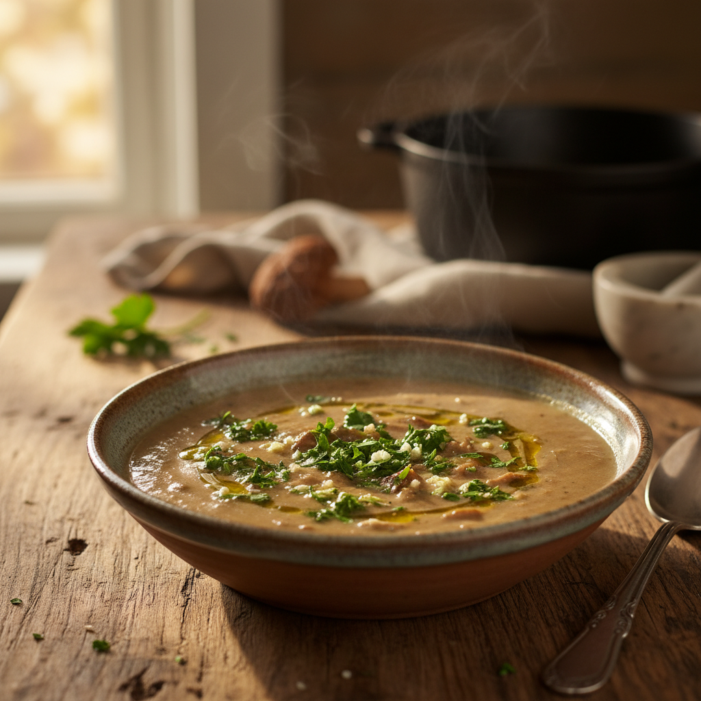 Diese cremige Steinpilzsuppe ist eine präzise Komposition aus tiefen, erdigen Aromen und einer frischen, würzigen Note. Das Rezept basiert auf einer zweistufigen Pilz-Strategie: Getrocknete Steinpilze liefern eine unvergleichliche Umami-Tiefe, während frische Champignons für Volumen und eine samtige Textur sorgen. Die abschließende Garnitur mit einer klassischen Persillade aus Petersilie, Knoblauch und Zitrone durchbricht die Reichhaltigkeit der Suppe und sorgt für ein ausbalanciertes Geschmackserlebnis. In diesem Beitrag erhältst du nicht nur das exakte Rezept, sondern auch das technische Wissen, um die häufigsten Fehler bei der Zubereitung von Pilzsuppen zu vermeiden. Wir analysieren jeden Schritt – von der korrekten Verwendung des Pilzwassers bis zur perfekten Emulsion mit Sahne – für ein konsistent hochwertiges Ergebnis.