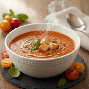 - Die fertige Tomatensuppe in Schalen füllen, mit frischen Basilikumblättern garnieren und heiß servieren. Dazu passen Croûtons oder frisches Brot.