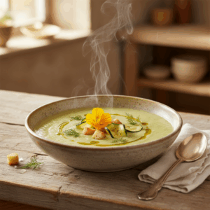 - Servieren: Die fertige Zucchinisuppe auf Schüsseln oder tiefe Teller verteilen. Mit den restlichen Basilikumblättern, einem Schuss gutem Olivenöl oder gerösteten Kürbiskernen garnieren und sofort servieren.