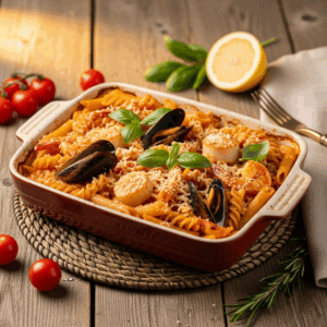 Cremiger Meeresfrüchte Nudelauflauf mit Zitronenkräutern
