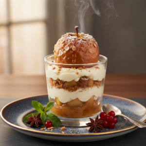 Dieses Bratapfel Schichtdessert vereint die klassischen Aromen der Winterzeit in einer effizienten und optisch ansprechenden Form. Anstatt Äpfel lange im Ofen zu garen, setzen wir auf ein schnell zubereitetes Apfelkompott, das durch Karamellisierung und Zimt die typische Bratapfel-Note erhält. Die Kombination aus säuerlichen Äpfeln, einer fettreichen Mascarpone-Quark-Creme und würzigem Spekulatius sorgt für ein ausgewogenes Verhältnis von Süße, Säure und Textur. Dieses Rezept eignet sich hervorragend für festliche Menüs, da es sich gut portionieren lässt und ohne Gelatine auskommt.