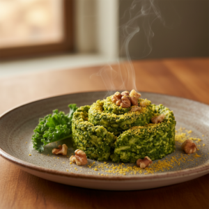 Dieses Rezept für Grünkohl-Pesto transformiert das klassische Wintergemüse in eine moderne, vielseitige Würzpaste. Anstelle des traditionellen Basilikums liefert der Grünkohl (Kale) eine robuste, erdig-nussige Basis, die hervorragend mit gerösteten Walnüssen harmoniert. Durch den Einsatz von Hefeflocken erhält dieses Pesto eine intensive Umami-Note, die Parmesan geschmacklich ersetzt und das Gericht rein pflanzlich hält. In diesem Beitrag erfährst du, wie du die feste Struktur des Kohls bändigst, warum das Rösten der Nüsse chemisch essenziell ist und wie du eine perfekte Emulsion herstellst.