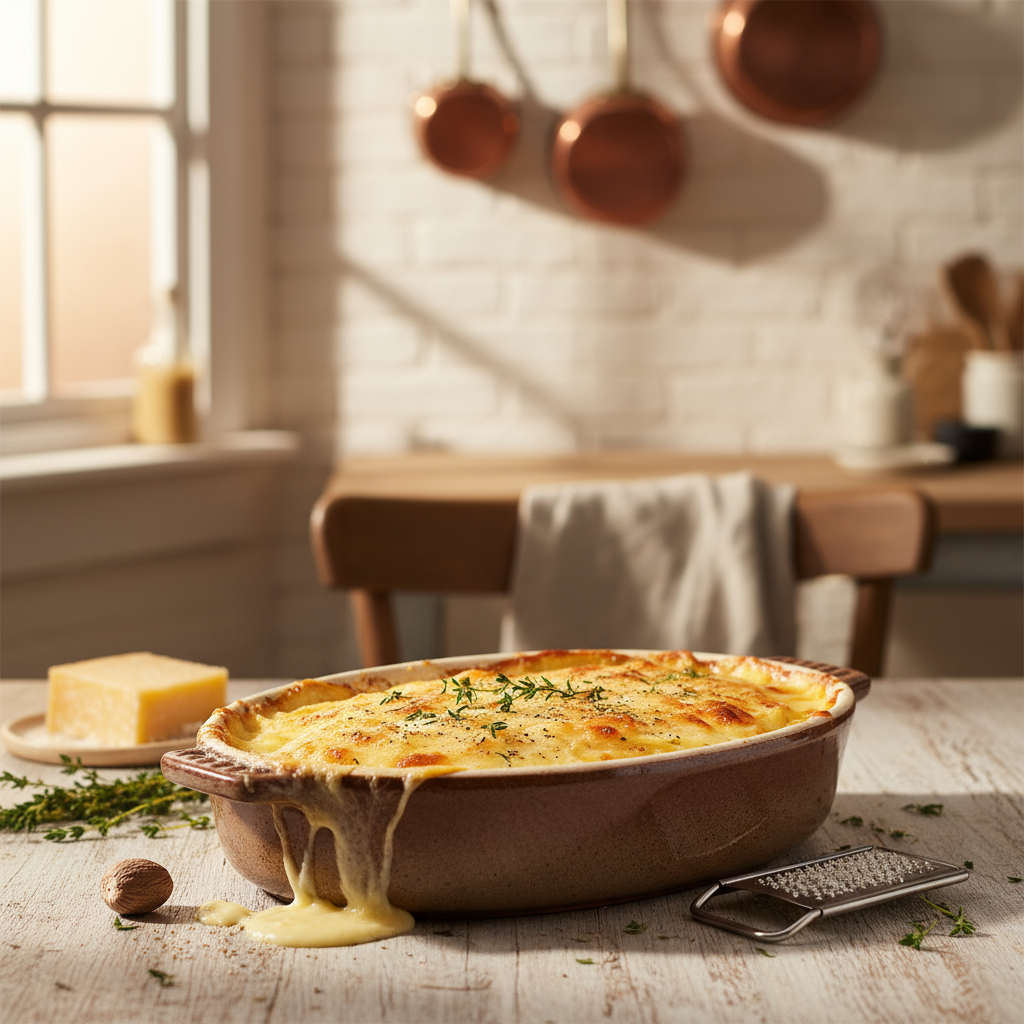 Die klassische Basis lässt sich gezielt erweitern. Gib für eine kräuterige Note einige Zweige frischen Thymian oder Rosmarin zwischen die Kartoffelschichten. Für eine intensivere Würze können dem Gruyère etwa 50 g frisch geriebener Parmesan beigemischt werden. Wer es deftiger mag, kann dünne Speckwürfel oder Schinken zwischen die Schichten geben.