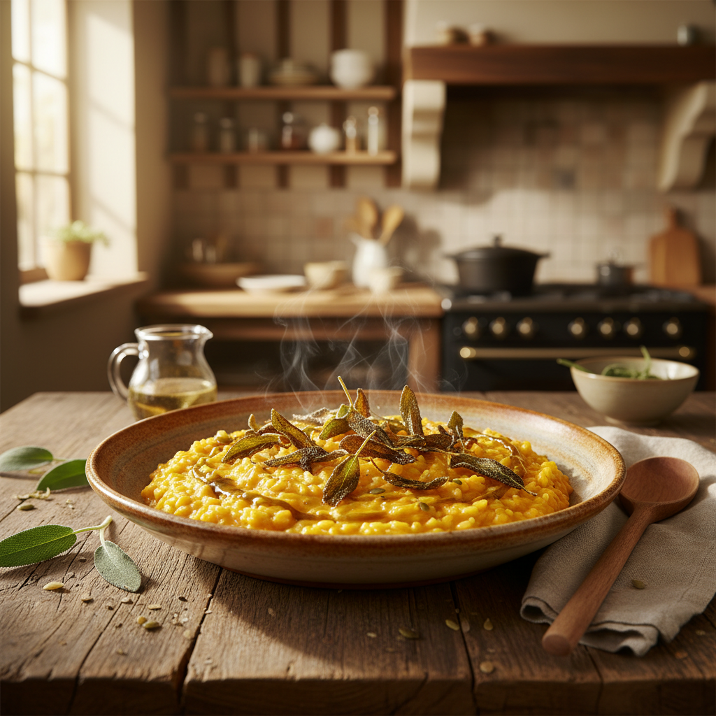 Cremiges Kürbisrisotto mit Weißwein und gebratenem Salbei