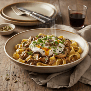 Klassischerweise wird Stroganoff mit Nudeln wie Tagliatelle oder Spätzle serviert. Es passt aber auch hervorragend zu Kartoffelpüree, Reis oder cremigem Polenta. Eine frische, leicht säuerliche Komponente wie ein einfacher grüner Salat mit Vinaigrette oder gedämpfter Brokkoli mit Zitronensaft bietet einen guten Kontrast zur reichhaltigen Sauce.