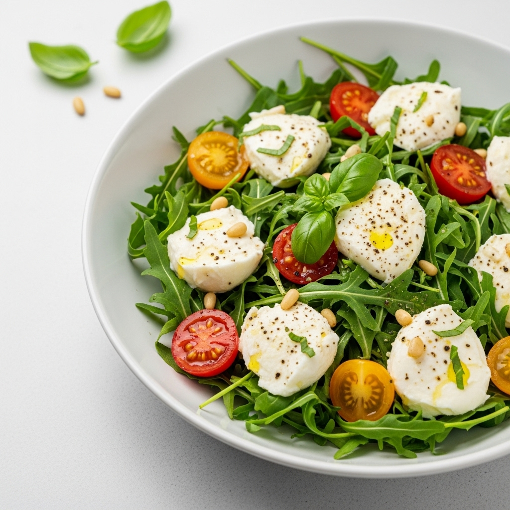 - Anrichten und Servieren: Den angemachten Rucola-Tomaten-Salat auf vier Tellern oder einer großen Servierplatte anrichten. Die gezupften Mozzarella-Stücke gleichmäßig darüber verteilen und zum Schluss mit den gerösteten Pinienkernen bestreuen. Sofort servieren, um die Frische und Knackigkeit des Rucolas zu bewahren.