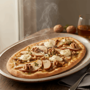Ein herausragender Flammkuchen mit Birne, Ziegenkäse und Walnuss basiert auf einem ausbalancierten Zusammenspiel von Aromen und Texturen. Das Erfolgsgeheimnis liegt in der gezielten Kombination gegensätzlicher, aber komplementärer Komponenten. Die natürliche Süße der reifen Birne und des Honigs bildet einen direkten Kontrapunkt zur charakteristischen Säure und Salzigkeit des Ziegenkäses. Diese Spannung wird durch die erdigen, leicht bitteren Noten der Walnuss ergänzt, die dem Gericht Tiefe verleihen. Die fette, milde Crème fraîche dient als neutrale Basis, die die Aromen verbindet und gleichzeitig den Teig vor dem Durchweichen schützt. Der hauchdünne, krosse Teig liefert den notwendigen textuellen Kontrast zur weichen Birne und dem geschmolzenen Käse. Das Ergebnis ist ein vielschichtiges Geschmackserlebnis, bei dem jeder Bissen süß, salzig, cremig und knusprig zugleich ist.