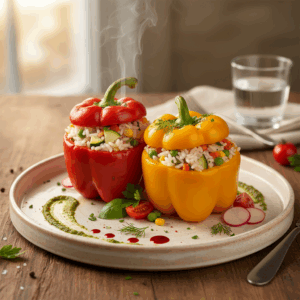 Ein klassisches Gericht neu interpretiert: Zarte Paprikaschoten, gefüllt mit einer würzigen Mischung aus Reis, frischem Gemüse und aromatischen Kräutern, sanft geschmort in einer leichten Tomatensauce. Ideal als sättigendes Hauptgericht.