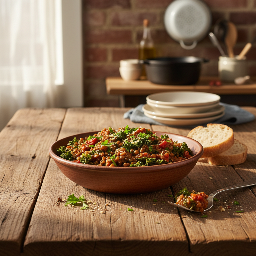 Diese Grünkohl-Bolognese ist eine moderne, vegetarische Interpretation des italienischen Klassikers, die speziell auf die Aromen der kalten Jahreszeit abgestimmt ist. Anstelle von Hackfleisch sorgen hier Berglinsen und gehackte Walnüsse für die notwendige Struktur und einen intensiven Biss. Die Kombination aus den erdigen Noten des frischen Grünkohls, der Süße des Wurzelgemüses und der Säure von Rotwein und Tomaten erzeugt ein komplexes Geschmacksprofil. In diesem Beitrag erfährst du, wie du durch präzise Schneidetechniken und die richtige Garzeit eine Sauce kochst, die auch ohne Fleisch durch Umami und Sämigkeit überzeugt.