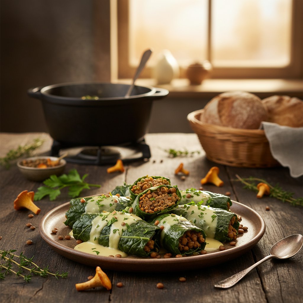 Klassische Rouladen sind ein Grundpfeiler der deftigen Küche. Dieses Rezept interpretiert den Klassiker neu und schafft eine rein pflanzliche, nährstoffreiche Variante, die geschmacklich und texturell überzeugt. Die Grünkohl-Rouladen mit Linsen-Pilz-Füllung kombinieren die erdigen, leicht herben Noten des Grünkohls mit einer Füllung, die durch Linsen, Pilze und Walnüsse eine komplexe Textur und tiefe Umami-Aromen erhält. Statt einer schweren, fetthaltigen Sauce setzen wir auf eine leichte, fruchtige Tomatensauce, die das Gericht ausbalanciert. In diesem Beitrag erhältst du nicht nur eine präzise Schritt-für-Schritt-Anleitung, sondern auch das technische Wissen, um jeden Schritt zu meistern – vom korrekten Blanchieren des Grünkohls bis zur perfekten Konsistenz der Füllung. Wir erklären die Funktion jeder Zutat und die kulinarischen Prinzipien, die dieses Gericht zu einem Erfolg machen.