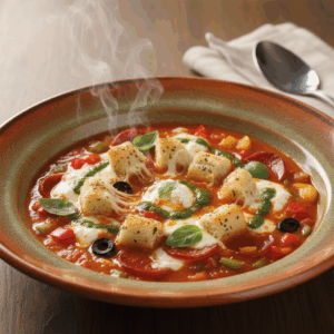 - Servieren: Die fertige, heiße Pizzasuppe auf tiefe Teller oder Schalen verteilen. Jede Portion großzügig mit dem geriebenen Mozzarella bestreuen und warten, bis dieser leicht geschmolzen ist. Optional mit frischen Basilikumblättern garnieren und sofort servieren.