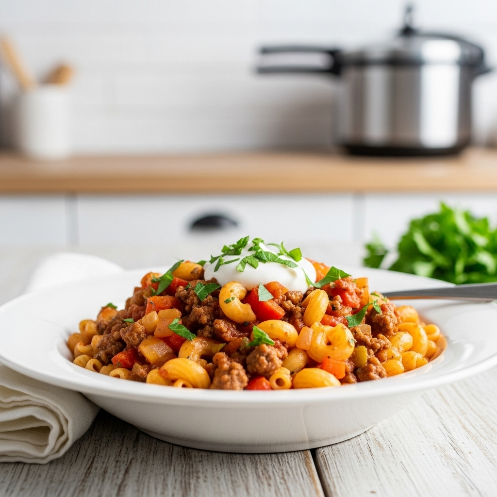 Die Verwendung eines Schnellkochtopfs (wie z.B. eines Instant Pot) ist für dieses amerikanische Gulasch mehr als nur eine Zeitersparnis. Sie verändert die Zubereitung auf fundamentaler Ebene und führt zu einem qualitativ besseren Ergebnis. Unter hohem Druck und bei Temperaturen über dem normalen Siedepunkt von 100 °C laufen chemische Prozesse beschleunigt ab. Die Maillard-Reaktion, die bereits beim Anbraten des Hackfleischs für Röstaromen sorgt, wird in der Druckphase intensiviert. Aromen von Tomaten, Brühe und Gewürzen verbinden sich tiefgreifender und durchdringen Fleisch sowie Nudeln vollständig. Gleichzeitig werden die Nudeln direkt in der Sauce gegart. Die dabei freigesetzte Stärke bindet die Flüssigkeit und erzeugt eine natürliche, sämige Konsistenz, ganz ohne den Einsatz von Mehl oder Speisestärke. Das Resultat ist ein Gericht, dessen Geschmackskomplexität an stundenlang geschmorte Speisen erinnert.