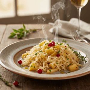 Eine aromatische Variante des klassischen Sauerkrauts, verfeinert mit der leichten Süße von Äpfeln und würzigen Noten von Wacholder. Dieses Gericht ist eine wärmende und schmackhafte Beilage, die einfach zuzubereiten ist und wunderbar zu deftigen Speisen passt.