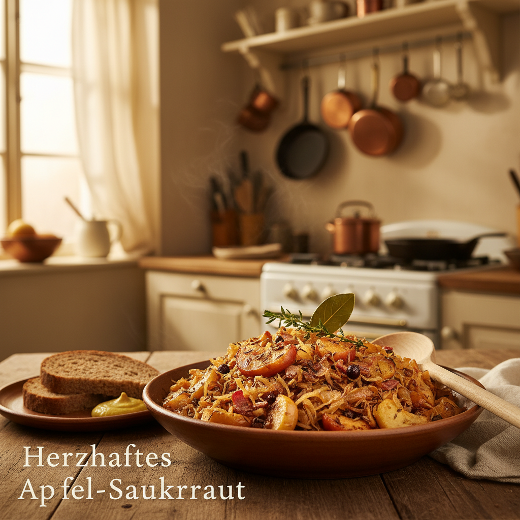 Apfel-Sauerkraut ist ein Klassiker der deutschen Küche und eine Beilage, die weit mehr ist als nur fermentierter Kohl. Die Kunst liegt in der perfekten Balance zwischen der charakteristischen Säure des Krauts, der fruchtigen Süße der Äpfel und einer herzhaften Würze. Dieses Rezept führt dich präzise durch die Zubereitung eines Apfel-Sauerkrauts, das durch die richtige Technik und sorgfältige Zutatenauswahl eine außergewöhnliche Geschmackstiefe erreicht. Du lernst hier nicht nur die einzelnen Schritte, sondern auch das „Warum“ dahinter, um das Ergebnis jedes Mal zuverlässig reproduzieren zu können. Wir konzentrieren uns auf die Methoden, die den Unterschied zwischen einem guten und einem ausgezeichneten Sauerkraut ausmachen – von der Wahl des richtigen Apfels bis zur entscheidenden Technik des Andünstens für maximale Aromenentwicklung.