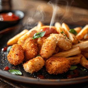 - Servieren: Die fertigen, knusprigen Nuggets sofort zusammen mit den warmen Pommes servieren. Dazu passen verschiedene Dips wie Ketchup, BBQ-Sauce oder ein cremiger Joghurt-Dip.