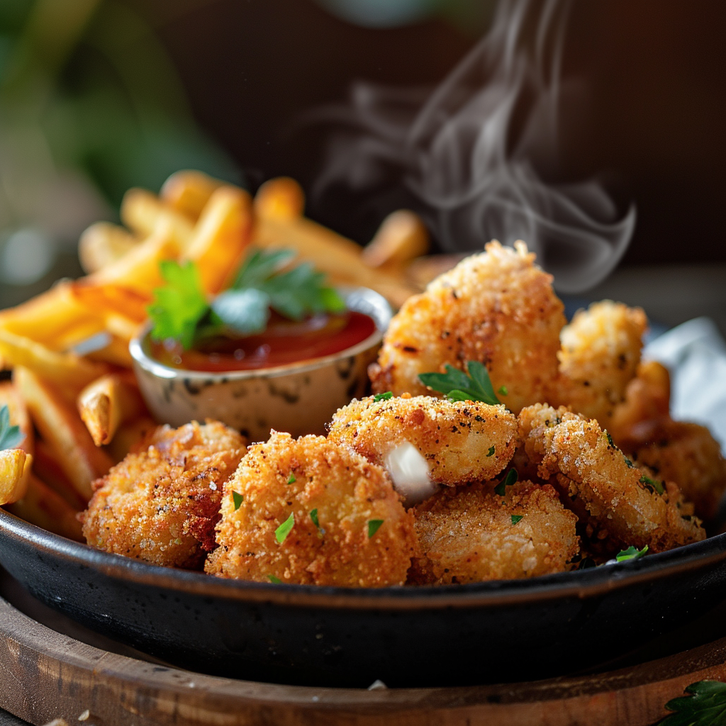 - Servieren: Die fertigen, knusprigen Nuggets sofort zusammen mit den warmen Pommes servieren. Dazu passen verschiedene Dips wie Ketchup, BBQ-Sauce oder ein cremiger Joghurt-Dip.