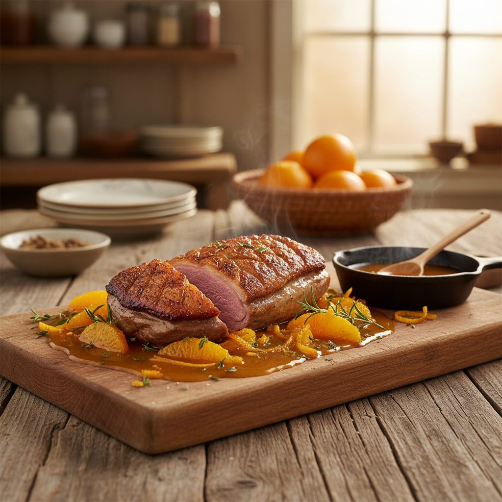 Die Zubereitung einer Entenbrust gilt oft als Königsdisziplin in der häuslichen Küche. Die Herausforderung besteht darin, zwei gegensätzliche Ziele zu erreichen: eine extrem knusprige Haut durch fast vollständiges Auslassen des subkutanen Fettes und gleichzeitig ein saftiges, rosa gebratenes Fleisch. Dieses Rezept kombiniert klassische französische Garmethoden mit einer aromatischen Orangensauce (Sauce à l’orange), deren Säure und Fruchtigkeit den hohen Fettgehalt der Ente kulinarisch ausbalancieren. Im Folgenden lernst du die technische Präzision hinter der Kalte-Pfanne-Methode und das korrekte Binden einer Sauce durch Montage kennen.